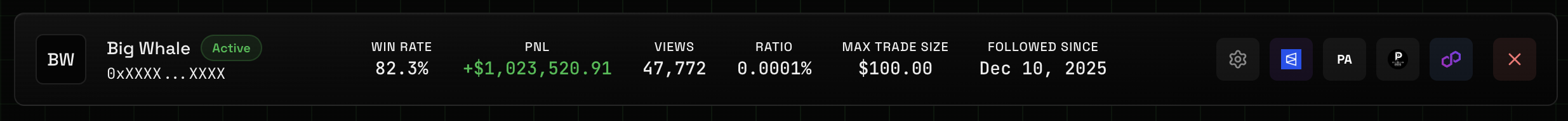 - Whenever the followed wallet opens or closes a trade, your trading wallet will mirror the action