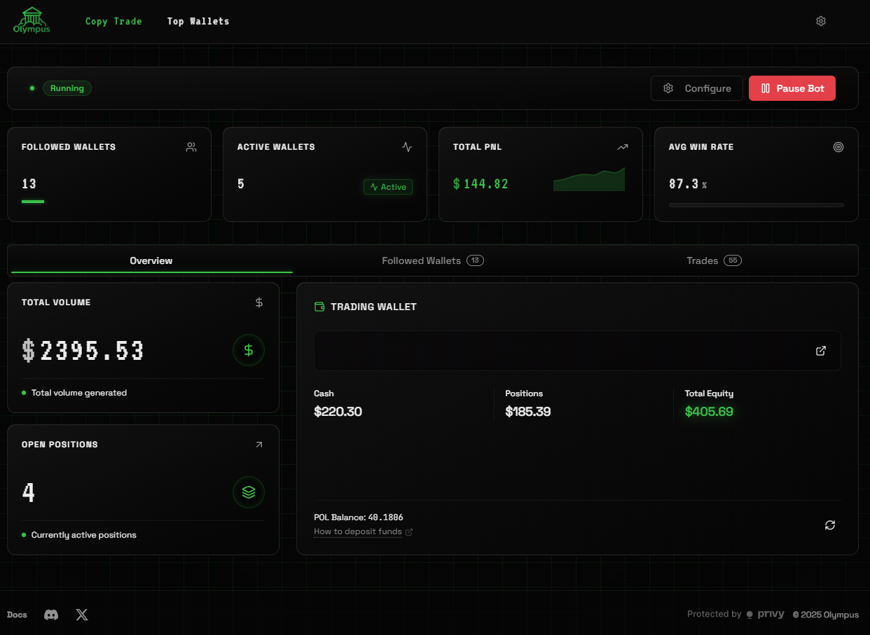 Welcome to Olympus โ your gateway to effortless copy trading on Polymarket.